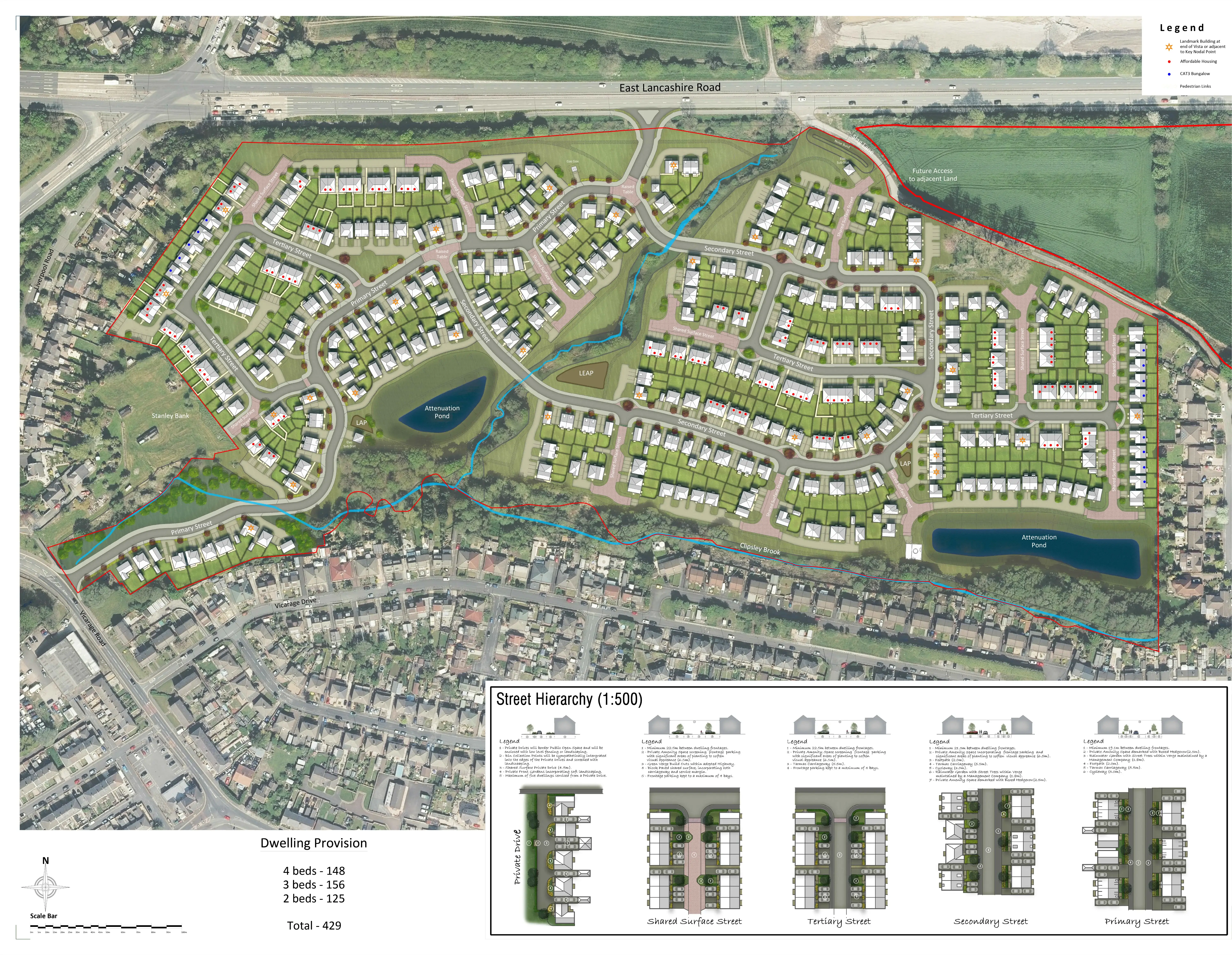 To promote health and wellbeing, a cycleway will run along the Primary and Secondary streets, allowing access to the existing cycle network on East Lancashire Road in the north and Vicarage Road to the southwest. Dwellings will also be provided with a means of on-plot cycle storage.